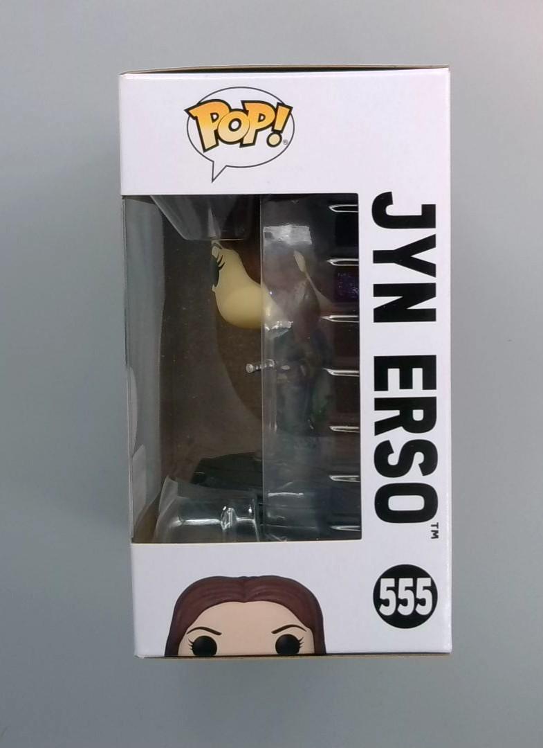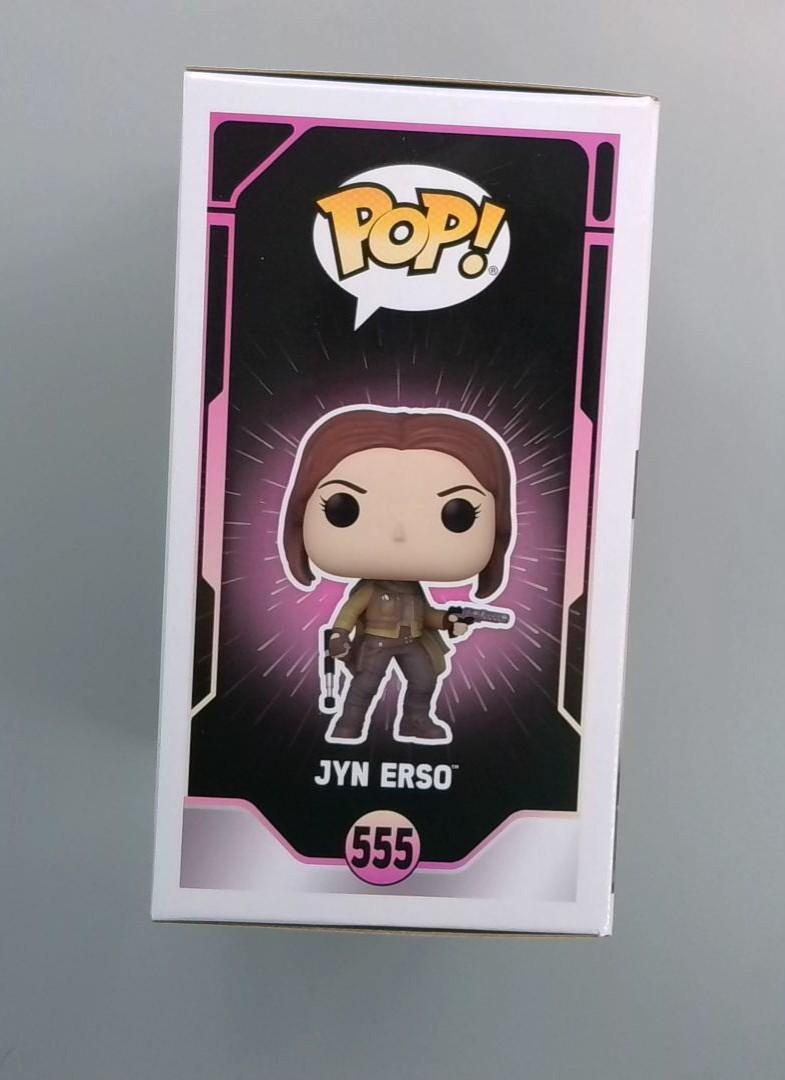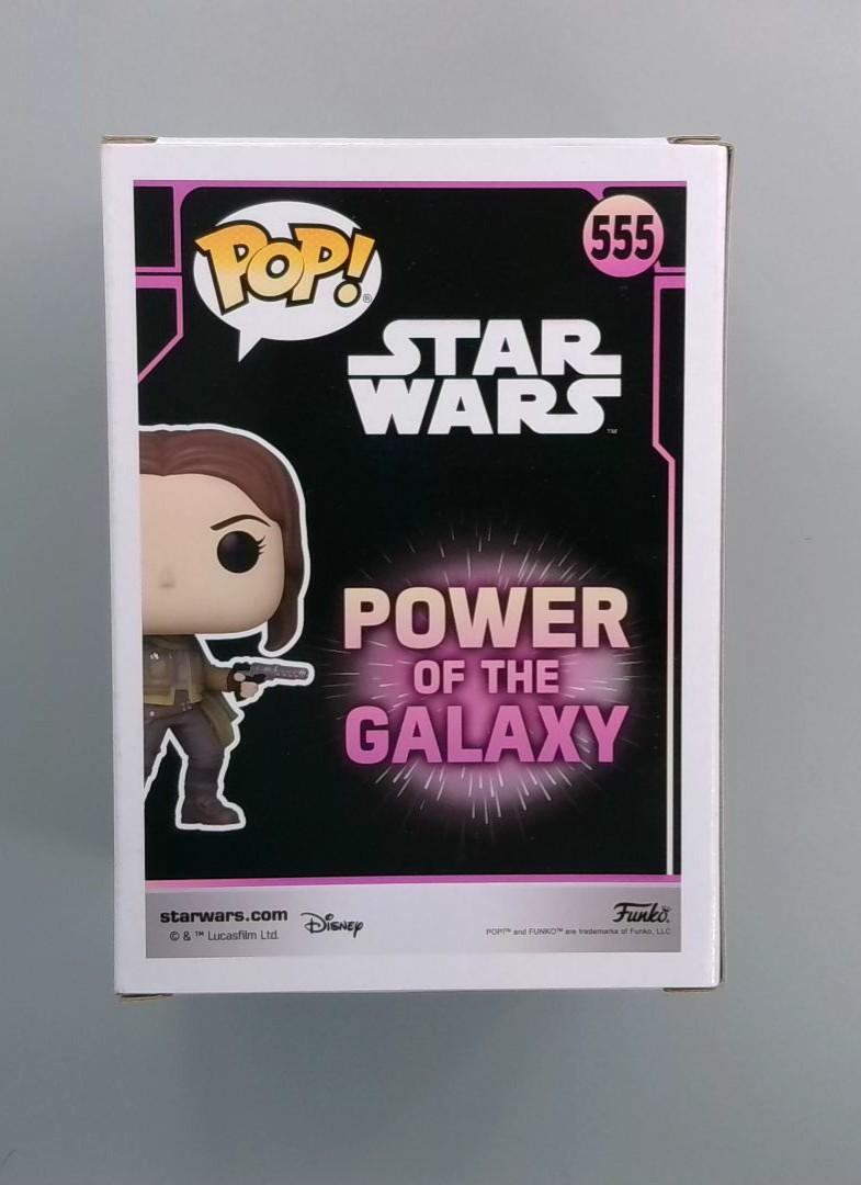 Funko Pop! vinyl figure of Jyn Erso from the Star Wars "Rogue One" film, part of the Power of the Galaxy Amazon exclusive series. The collectible features Jyn in her Rebel military outfit, holding a blaster, and is numbered 555 in the Funko Pop! Star Wars collection. This stylized bobblehead captures the character's determined look from the film that explores the mission to steal the Death Star plans.