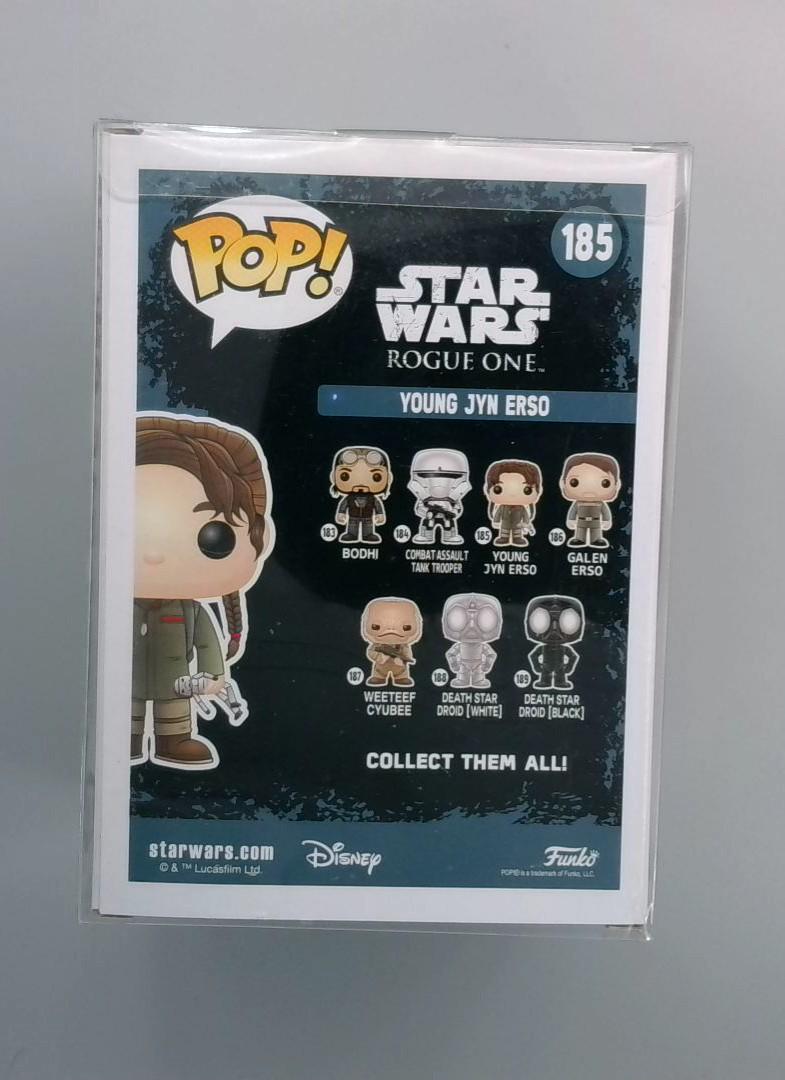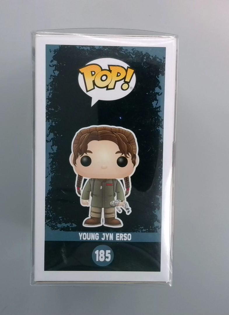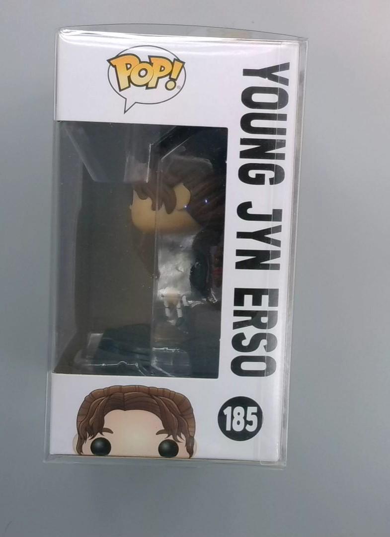 Funko Pop! vinyl figure of Young Jyn Erso from Star Wars: Rogue One, numbered 185 in the Pop! series. The figurine depicts Jyn in her rebel military outfit, capturing her youthful appearance from the film. Part of the collectible Funko Pop! Star Wars line, this figure is designed in the distinctive stylized chibi format with large head and small body. The packaging includes a collector's card showing other available figures from the Rogue One collection.