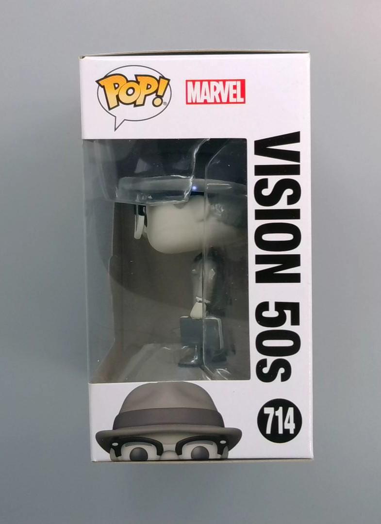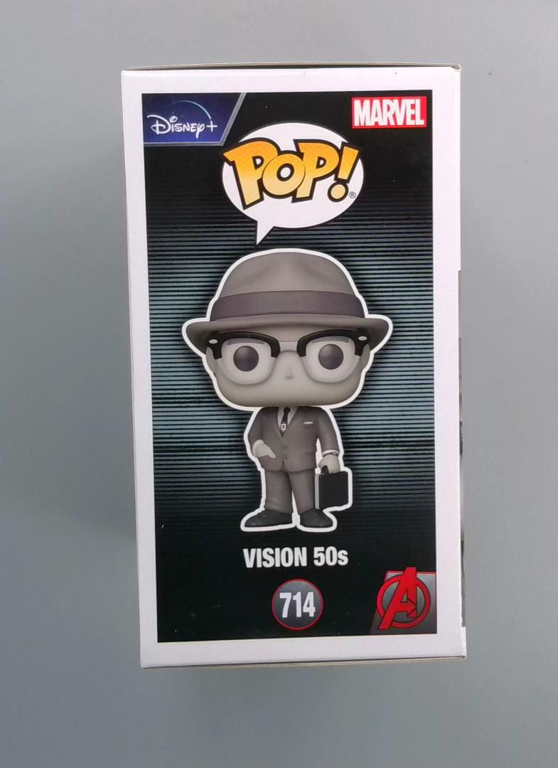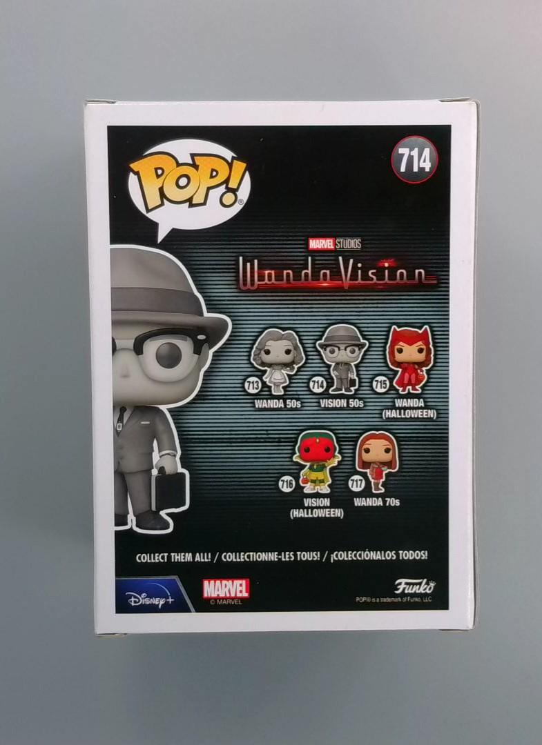 Funko Pop! vinyl figure of Vision in his 1950s black-and-white aesthetic from the Marvel Studios Disney+ series WandaVision. This collectible captures Vision in a vintage suit, fedora, and thick-framed glasses, reflecting the show's nostalgic period-specific styling. Part of the WandaVision Funko Pop! collection (number 714), this figure is designed to match the character's look during the sitcom-inspired episodes of the series. The box showcases additional variants from the same collection, including different versions of Wanda.