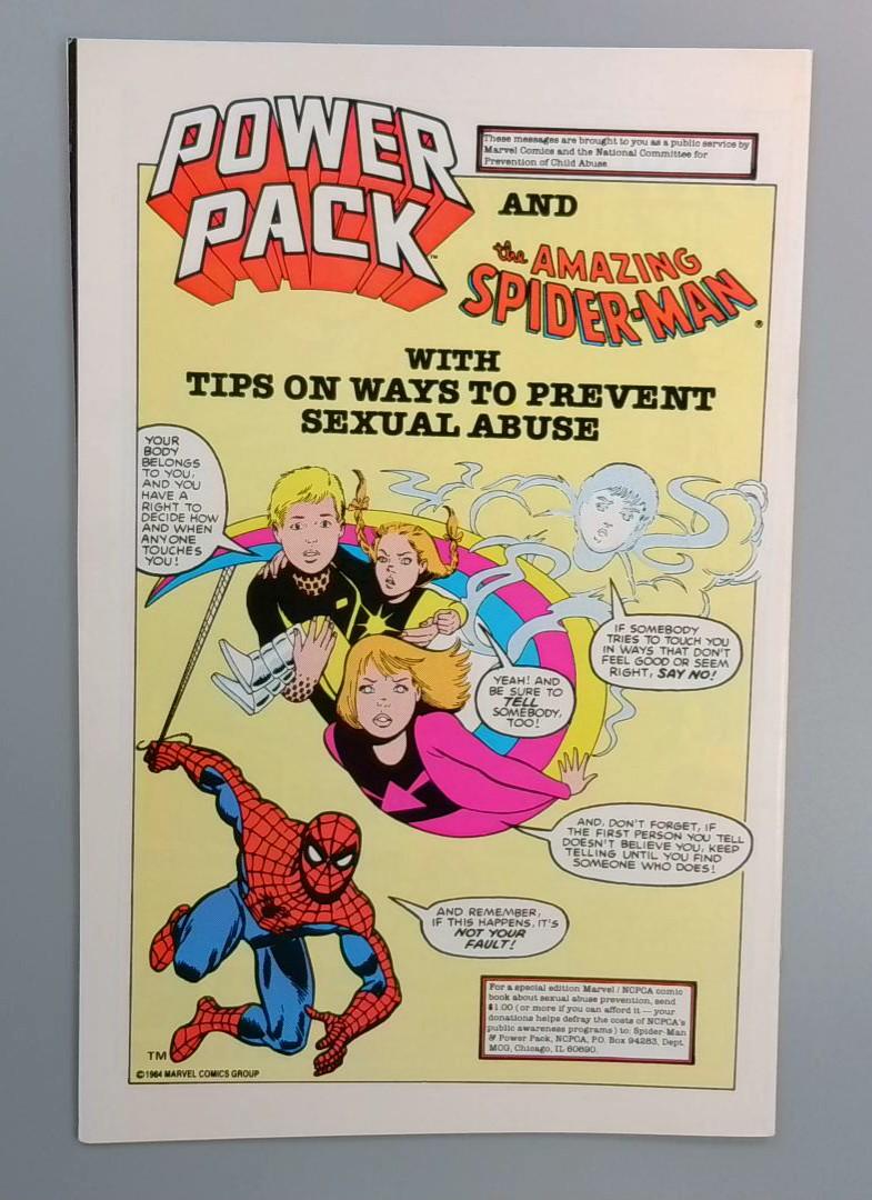 G.I. Joe: A Real American Hero #49 (Marvel, July) continues the series’ action as the Joes tangle with Cobra operatives while a mysterious villain is shown abducting a captive on the striking cover. Cover shows the Marvel 25th Anniversary box and 75¢ price; classic Marvel era artwork and logo. Includes a full-page Power Pack / Amazing Spider-Man public service ad with tips on preventing sexual abuse.
