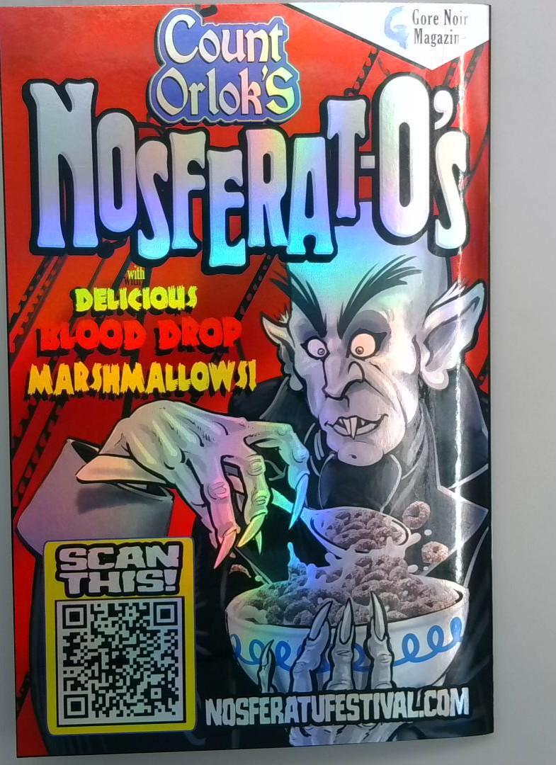 GORE NOIR MAGAZINE ISSUE 1 - A horror culture magazine published in January, priced at $20.00, presented as a special comic-sized edition. This striking cover features a haunting reference to classic slasher cinema, depicting a skull-faced killer and a bloodied figure with the caption "Alas, poor Michael Myers—I killed him well!" The vibrant purple and pink backdrop creates an unsettling atmosphere perfectly suited for horror enthusiasts. The magazine celebrates the darker side of pop culture with its edgy aesthetic and bold design. COUNT ORLOK'S NOSFERATU'S - A Gore Noir Magazine publication featuring Count Orlok, the iconic vampire character, in a playful cereal-box style parody. This whimsical cover showcases the classic Nosferatu character promoting "Delicious Blood Drop Marshmallows" in a humorous take on breakfast cereals. The red background and vibrant gradient text create an eye-catching design, while a QR code invites readers to scan for more content at nosferatufestival.com. This piece perfectly blends horror nostalgia with modern interactive marketing and collectible appeal.