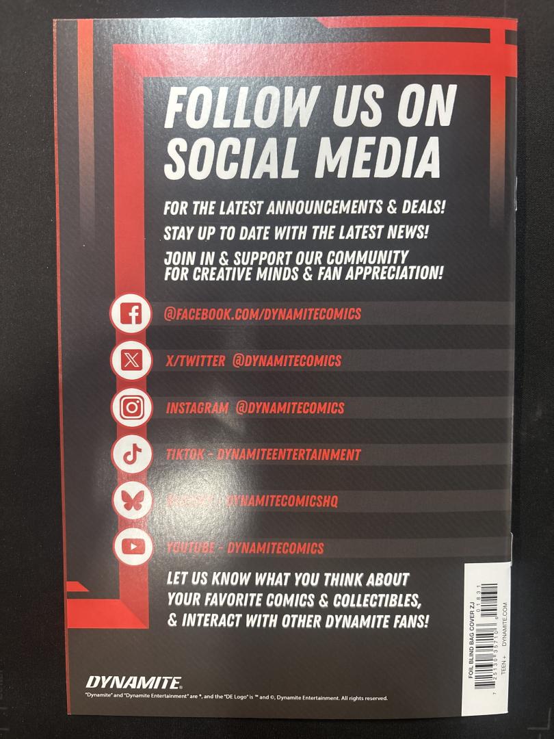 This issue showcases dynamic character artwork with two figures prominently displayed on the cover. The illustration features bold, eye-catching colors and detailed character design work typical of modern comic book cover art. The back cover displays Dynamite Entertainment's social media and community engagement information, inviting readers to connect across multiple platforms including Facebook, Twitter, Instagram, TikTok, and YouTube.