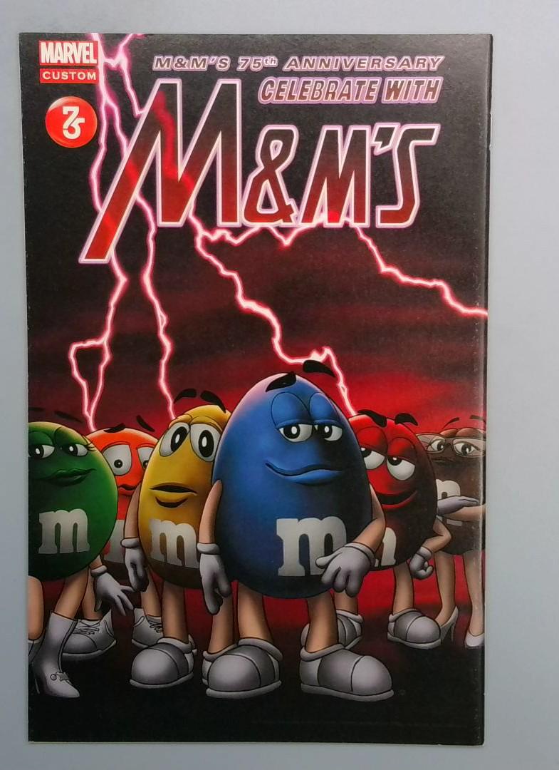 This lot includes two Marvel comic books: a Hawkeye #1 (2012) first issue featuring Kelly Thompson and Leonardo Romero, with a bright yellow cover showing the character in purple costume with bow and arrows, priced at 39 cents, in excellent condition; and a Marvel Custom M&M's 75th Anniversary comic #3 celebrating M&M's characters in superhero style with dynamic red lightning effects on dark background, also in excellent condition. Both items are complete with no visible damage or missing parts. These represent modern collectible comics with vibrant, well-preserved covers.