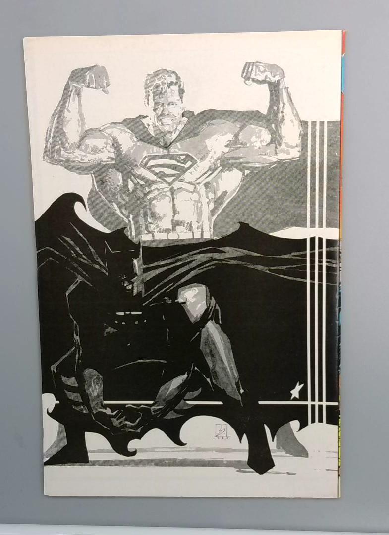 The back cover features a striking black and white illustration showcasing Superman and Batman in a powerful artistic composition, with Superman prominently displayed flexing his muscles above a stylized Batman silhouette.