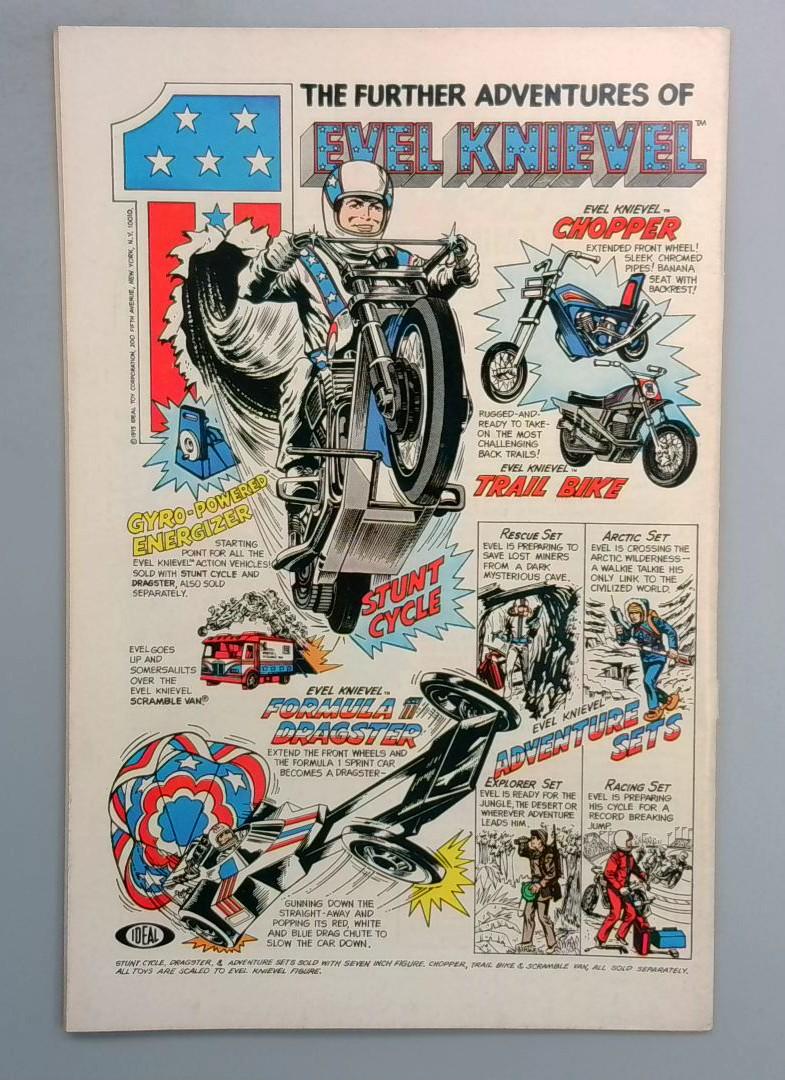 Also included is a promotional insert featuring Evel Knievel action figures and vehicles, including the Chopper, Trail Bike, Stunt Cycle, Formula I Dragster, and Adventure Sets—a glimpse into 1970s toy marketing within the pages of Marvel comics.