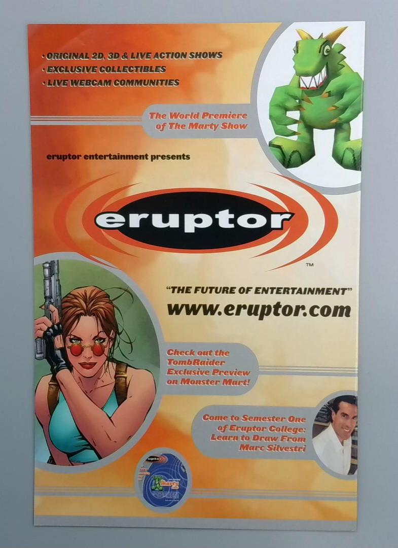 Also included is an Eruptor Entertainment promotional flyer advertising original animation, exclusive collectibles, live webcam communities, and exclusive previews, featuring characters from their various entertainment properties and promoting www.eruptor.com as "The Future of Entertainment."