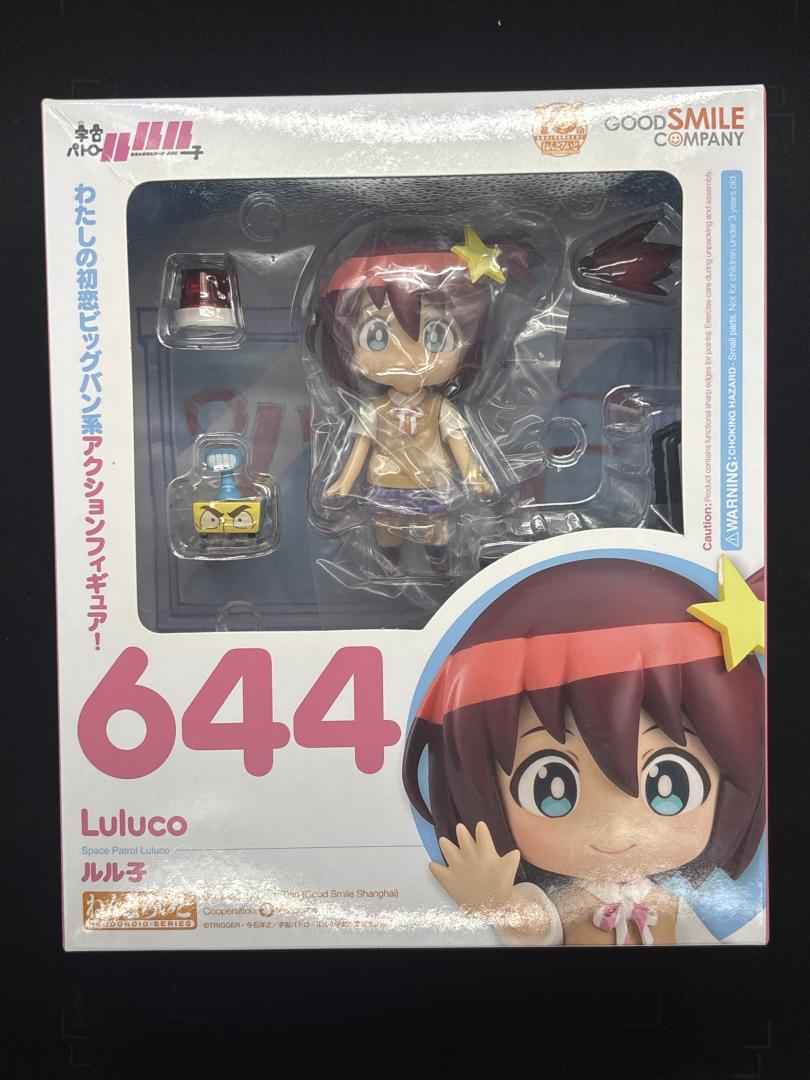 Nendoroid Luluco #644 figure featuring the character in a cheerful pose wearing a yellow top and purple skirt with her characteristic red and yellow headband. The figure includes multiple interchangeable parts and accessories including alternate facial expressions, hands, and what appears to be a small companion piece. The figure is in excellent condition, still sealed in its original packaging with no visible damage or wear. All components appear to be present and accounted for based on the packaging imagery shown.