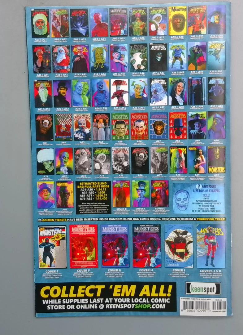 The back cover reveals an extensive checklist of collectible trading cards and variant covers, indicating this is part of a larger series from Keenspot. The promotion mentions 25 golden tickets inserted in random blind bag comic books, offering readers the chance to redeem special treats and encouraging collectors to find all the variants available at local comic stores and online.