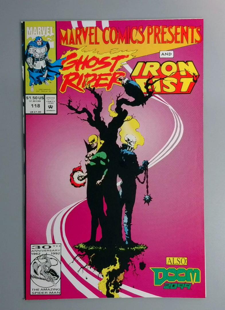 Marvel Comics Presents #118 features two iconic stories - a Wolverine cover and appearance, and a backup Giant Man tale. The main cover showcases Wolverine in his classic yellow and blue costume, dramatically posed with his signature adamantium claws. This issue is part of Marvel's 30th Anniversary commemorative series from 1992, with a notable appearance by the Amazing Spider-Man logo in the corner. The second comic, Marvel Comics Presents #118, highlights Ghost Rider and Iron Fist in a visually striking pink and black cover. The silhouetted characters are positioned against a stylized background, creating a dramatic and atmospheric image that hints at an intense supernatural storyline.