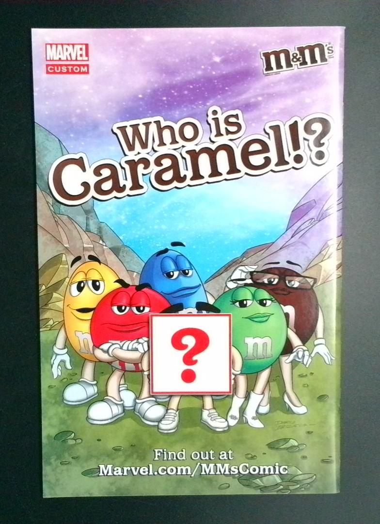 The variant edition includes a bonus Marvel/M&M's custom promotional insert asking "Who is Caramel?" as part of a special marketing crossover, directing readers to find out more at Marvel.com/MMsComic.