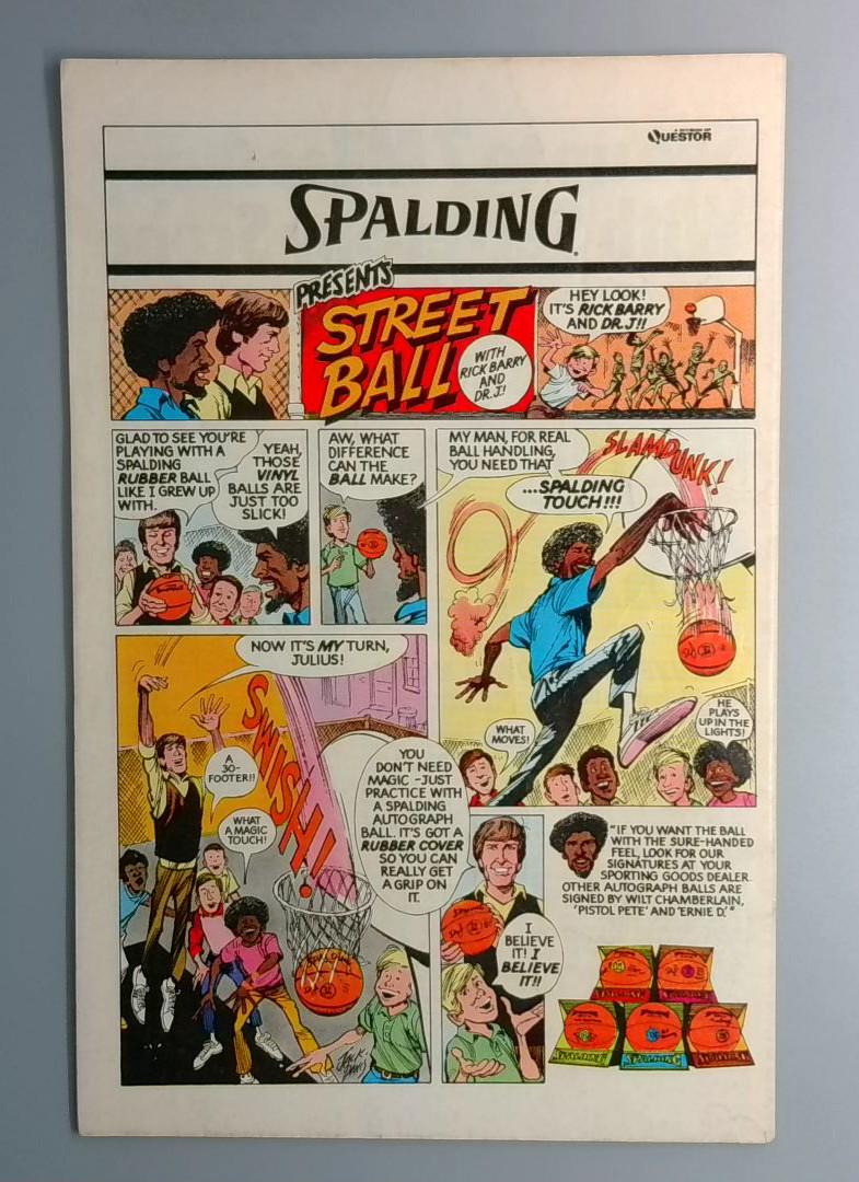 The interior includes a Spalding sports promotion comic strip titled "Street Ball," featuring Rick Barry and Dr. J in an advertisement comic that showcases the magic of a Spalding rubber basketball through humorous narrative panels.