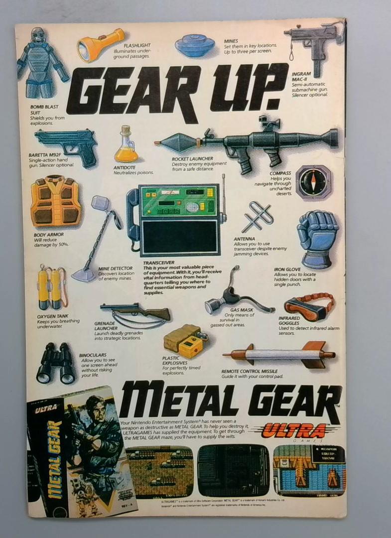 A Marvel trading card is bound into this issue, and an advertisement for Metal Gear Ultra video game appears on the back cover, providing a snapshot of entertainment marketing from the late 1980s.