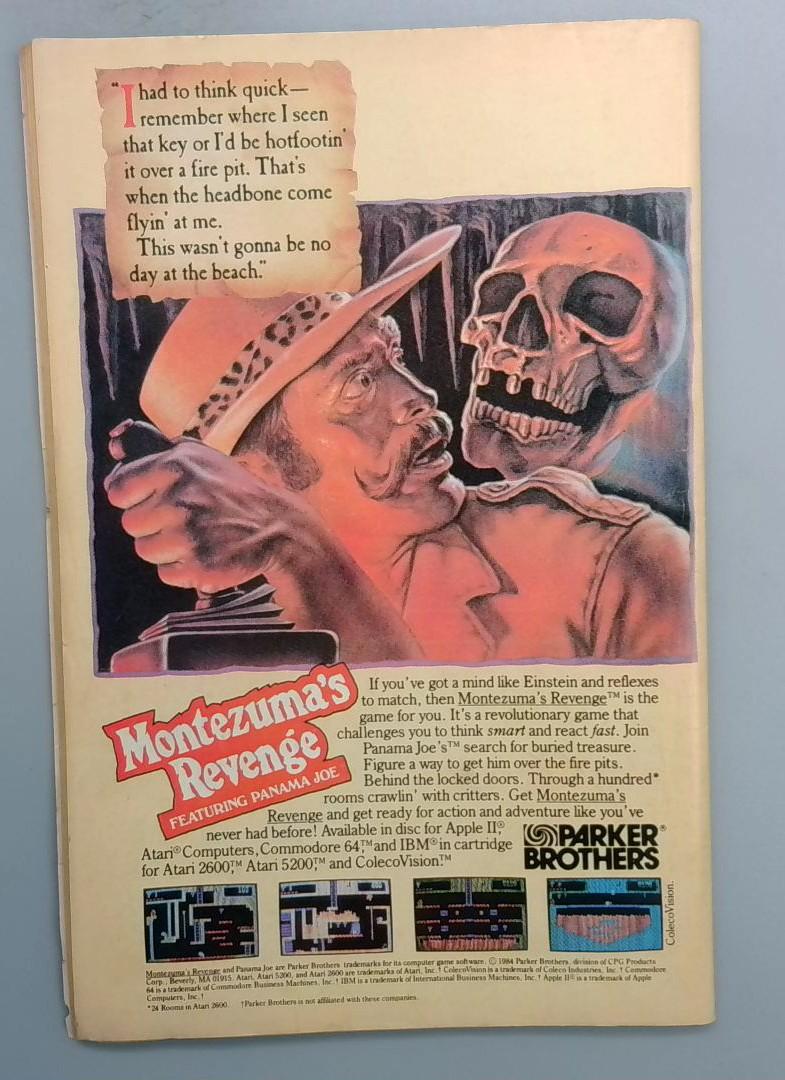 This issue includes "Steal This Planet!", a rock fable story that showcases the creative storytelling Marvel was known for during this era. The eye-catching cover artwork depicts the New Mutants in an action-packed sci-fi scenario, with vibrant illustrations that capture the dynamic energy of the team. The back cover features a vintage advertisement for Montezuma's Revenge, a classic Parker Brothers computer game, adding to the nostalgic appeal of this 1984 publication.