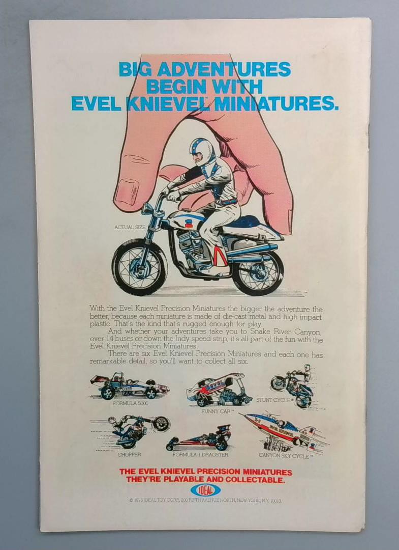 The back cover includes a full-page advertisement for Evel Knievel Precision Miniatures by Ideal Toy Corp, featuring die-cast metal vehicles and playable action sets from the 1970s toy line.