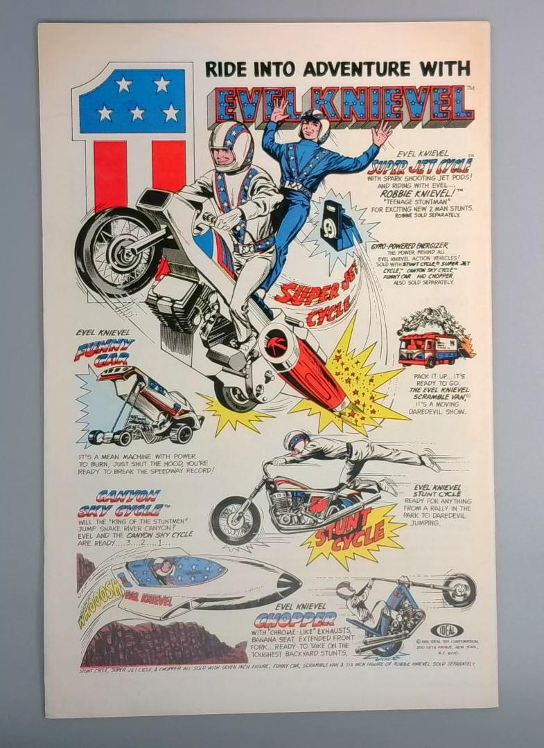 The included advertisement page highlights Evel Knievel action figures and vehicles from Ideal, featuring the famous daredevil's licensed merchandise including the Power Cycle, Stunt Cycle, and Canyon Sky Cycle, reflecting the toy tie-in promotions popular during this era of Marvel Comics.