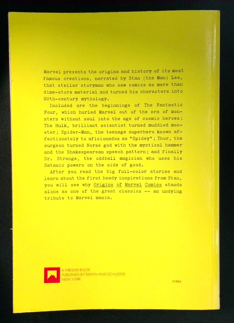 Origins of Marvel Comics - A Fireside Book published by Simon and Schuster, featuring a comprehensive collection narrated by Stan Lee that explores the genesis and history of Marvel's most iconic characters and their creation during the Silver Age of comics.