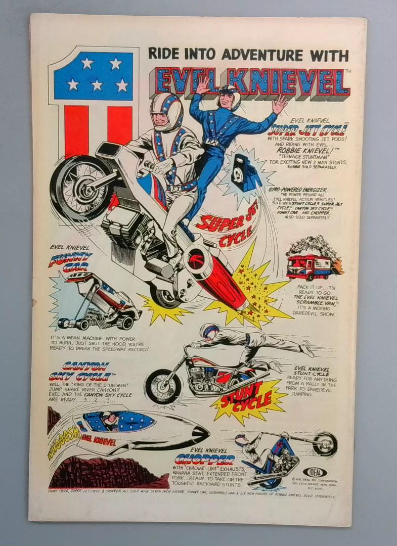 The back cover includes a promotional advertisement for Evel Knievel toys and vehicles, featuring the legendary stuntman's various motorcycles and vehicles with "Stunt Cycle," "Dragster," and other action-oriented products highlighted for collectors and children alike.