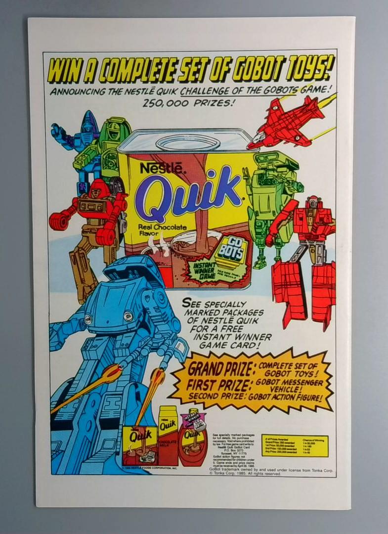 The back cover features a Nestlé Quik promotional advertisement announcing the "Quik Challenge of the Gobots Game" with 250,000 prizes available, including a complete set of Gobot 1095 toys as the grand prize. This cross-promotional content is typical of the era's marketing tie-ins between comic books and popular toy lines.