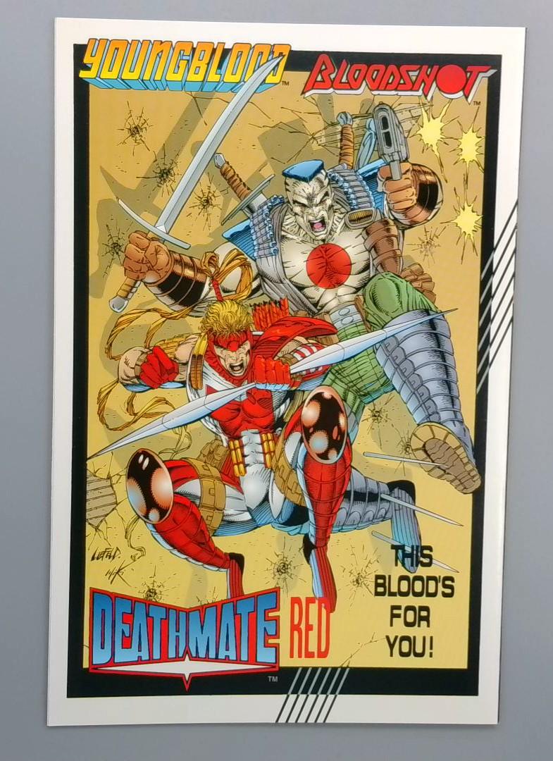 Prophet #1 from Image Comics introduces an intense, muscular character with a fierce expression, wearing a purple and gold armor-like costume. The first issue showcases the character's powerful presence, with metallic arm guards and a distinctive hairstyle. This debut issue is part of Extreme Studios' line of comics, promising action-packed storytelling and dynamic artwork. Deathmate Red featuring Youngblood and Bloodshot is a crossover comic that brings together two prominent characters from different comic book universes. The cover depicts high-energy action with multiple characters engaged in combat, highlighting the intense narrative. The bold "This Blood's for You!" tagline suggests a violent and dramatic storyline involving these powerful characters.
