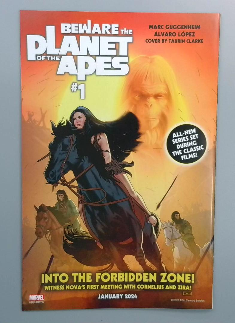 Punisher #1 - A unique, chibi-style variant cover featuring a stylized, angry version of the Punisher in his iconic blue tactical gear. This Marvel comic presents a fresh, cartoonish take on the gritty antihero, offering a playful contrast to the character's typically dark aesthetic. The cover art showcases the Punisher with a scrunched, determined expression, emphasizing his uncompromising nature. Beware the Planet of the Apes #1 - An exciting new Marvel series set during the classic Planet of the Apes film era. This first issue promises to explore uncharted territory, featuring Nova's inaugural encounter with key characters Cornelius and Zirai. The cover depicts a dramatic scene with a figure on horseback riding through a fiery, apocalyptic landscape, suggesting a thrilling adventure into the Forbidden Zone.
