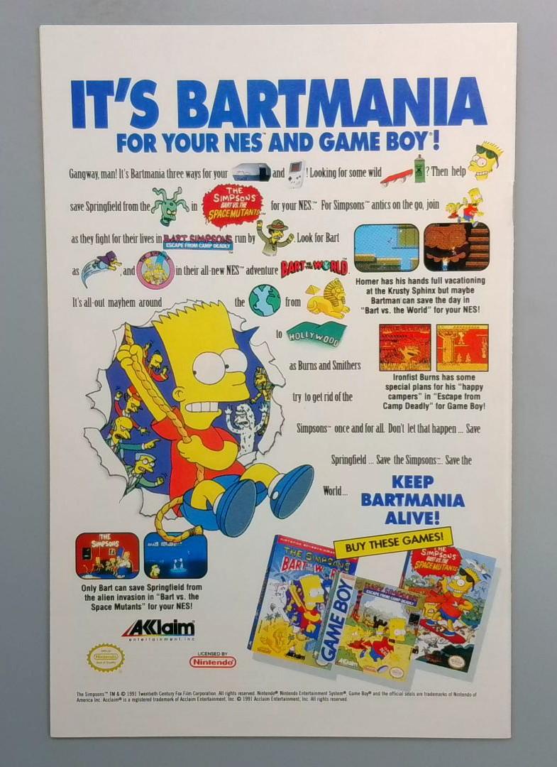Bart vs. the Space Mutants Advertisement - A full-page promotional advertisement for Acclaim Entertainment's Simpsons video game series, featuring multiple game titles for NES and Game Boy platforms including Bart vs. the Space Mutants and Escape from Camp Deadly.