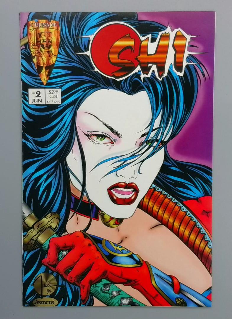 "Crusade Publications' CHE #1 premiere issue features a striking, stylized female protagonist with intense green eyes and bold blue-black hair, set against a vibrant purple and red background. The cover showcases an Asian-inspired character with a distinctive choker and holding two weapons, suggesting an action-driven narrative with potential martial arts or cyberpunk themes. The artwork displays a sophisticated, graphic novel-style aesthetic characteristic of alternative comics from the early to mid-1990s. This first issue promises an intriguing new series with a strong central character."