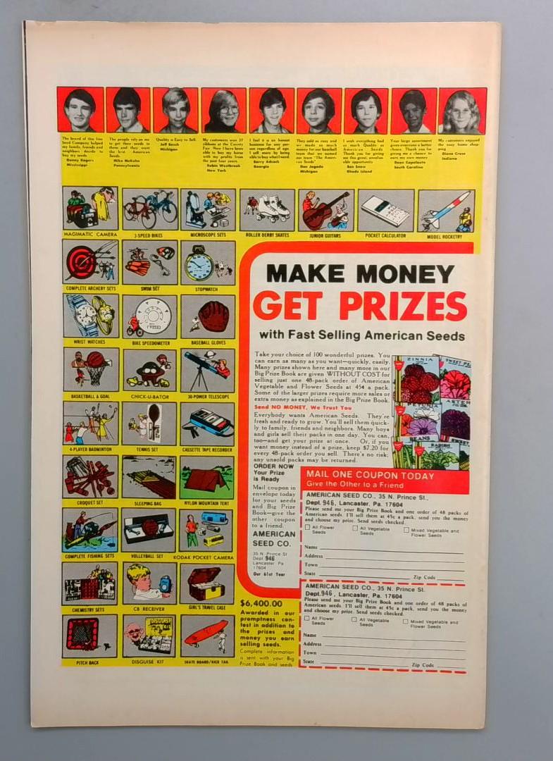 The back cover includes an American Seed Company mail-order promotional advertisement offering prizes and money-making opportunities, typical of vintage comic book merchandising from this era.