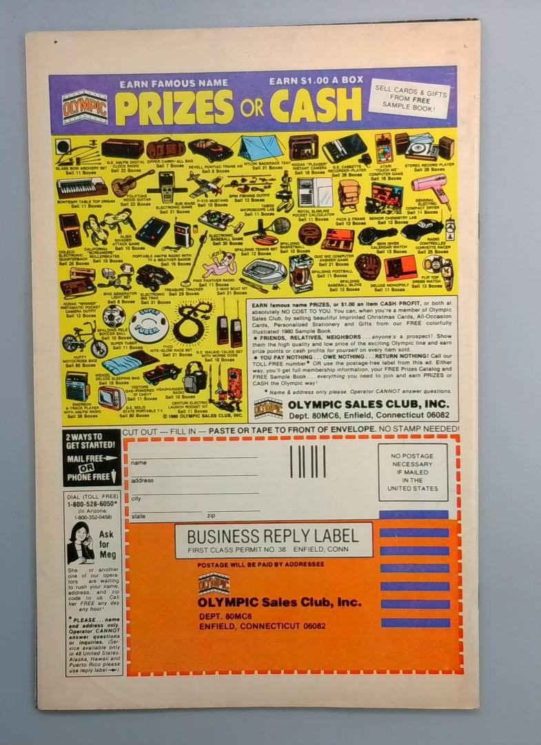 The back cover features an Olympic Sales Club, Inc. promotional insert with a extensive prize catalog offering merchandise and cash rewards. This vintage mail-in promotion is a fascinating artifact of 1980s direct marketing and comic book culture.