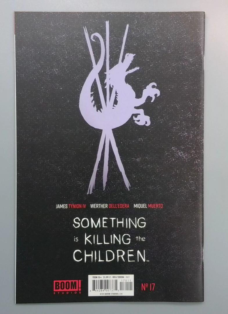 Something is Killing the Children #17 continues the dark and gripping horror series from BOOM! Studios, focusing on a mysterious threat targeting children. The comic follows characters battling an unseen, sinister force that seems to be hunting and eliminating young people. Created by James Tynion IV, Werther Dell'Edera, and Miquel Muerto, this issue promises intense storytelling and atmospheric artwork that has made the series critically acclaimed. The cover dramatically illustrates the tension and danger at the heart of the narrative, with characters posed against a blood-red background.