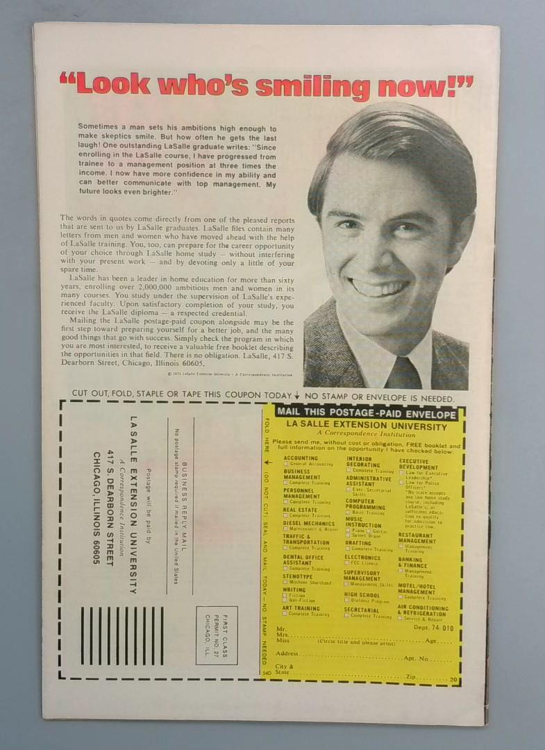 The back cover includes a LaSalle Extension University correspondence school advertisement, a common educational insert found in comics of this era. This is an ungraded raw copy in its original state.