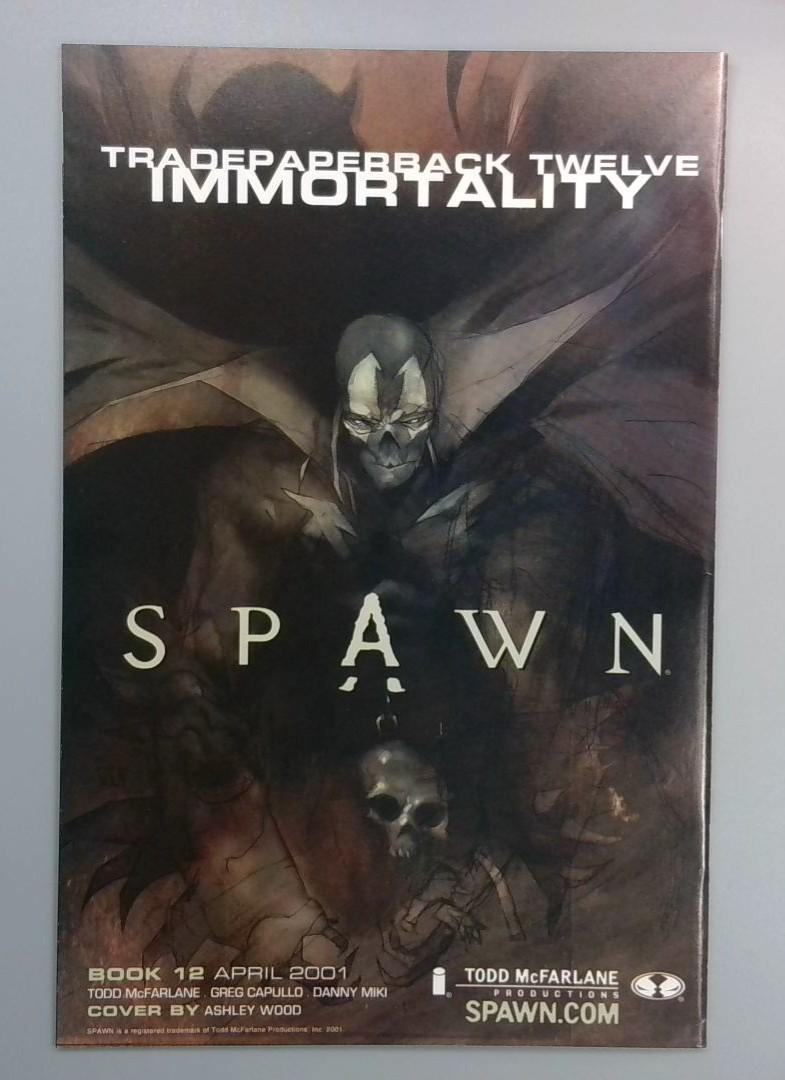 Spawn #106 features a striking red and silver cover showcasing the iconic antihero in a dynamic, angular pose against a dark background. The issue is part of the long-running Image Comics series created by Todd McFarlane, known for its dark, supernatural storytelling. This particular cover highlights Spawn's distinctive cape and mysterious silhouette, with glowing eyes piercing through the darkness. The Spawn: Immortality Tradepaperback (Book 12) from April 2001 collects a significant story arc in the Spawn mythology. Featuring creative work by Todd McFarlane, Greg Capullo, and Danny Miki, this collection delves deeper into the complex supernatural world of the character, with a moody, atmospheric cover by Ashley Wood that emphasizes the series' dark and introspective tone.