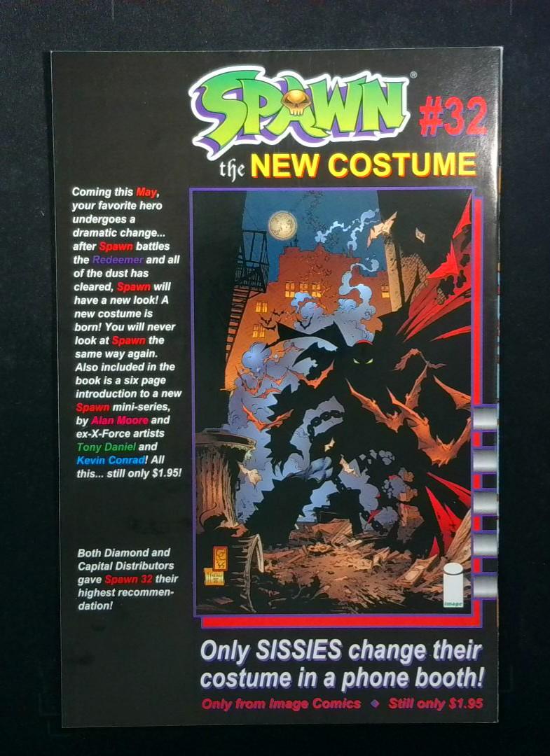 Spawn #29 (Image) — Todd McFarlane cover and art depicting Spawn in a brutal, protective scene as he shields a child amid splattered necroplasmic gore. A dark, character-driven installment in McFarlane’s run that highlights Spawn’s violent clashes with supernatural forces. Back cover includes a promo for Spawn #32 and the "new costume" storyline.