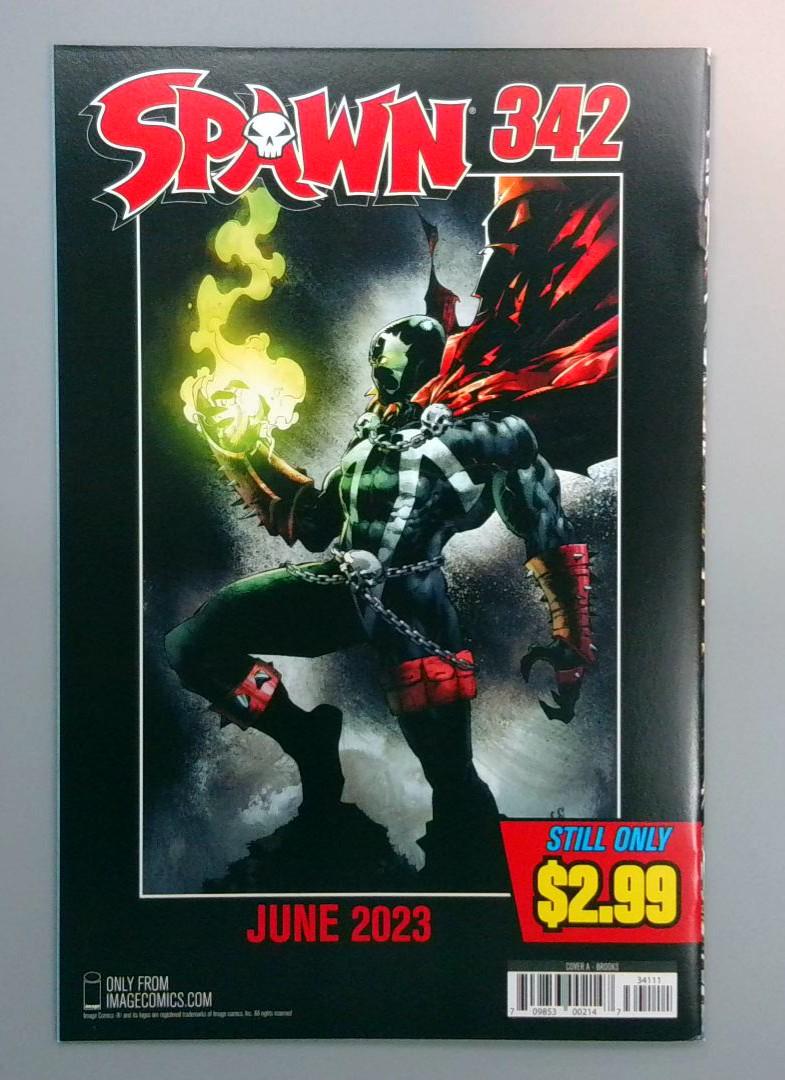 Spawn #342 continues the epic saga of Al Simmons, the hellspawn warrior battling demonic forces and supernatural threats in a gritty urban hellscape. This issue features intense action sequences with Spawn confronting monstrous entities and angelic adversaries amidst a chaotic, shadowy battlefield. The cover artwork by Greg Capullo captures the dramatic confrontation, highlighting Spawn's iconic necroplasmic powers and chain weaponry in a visually striking variant design.