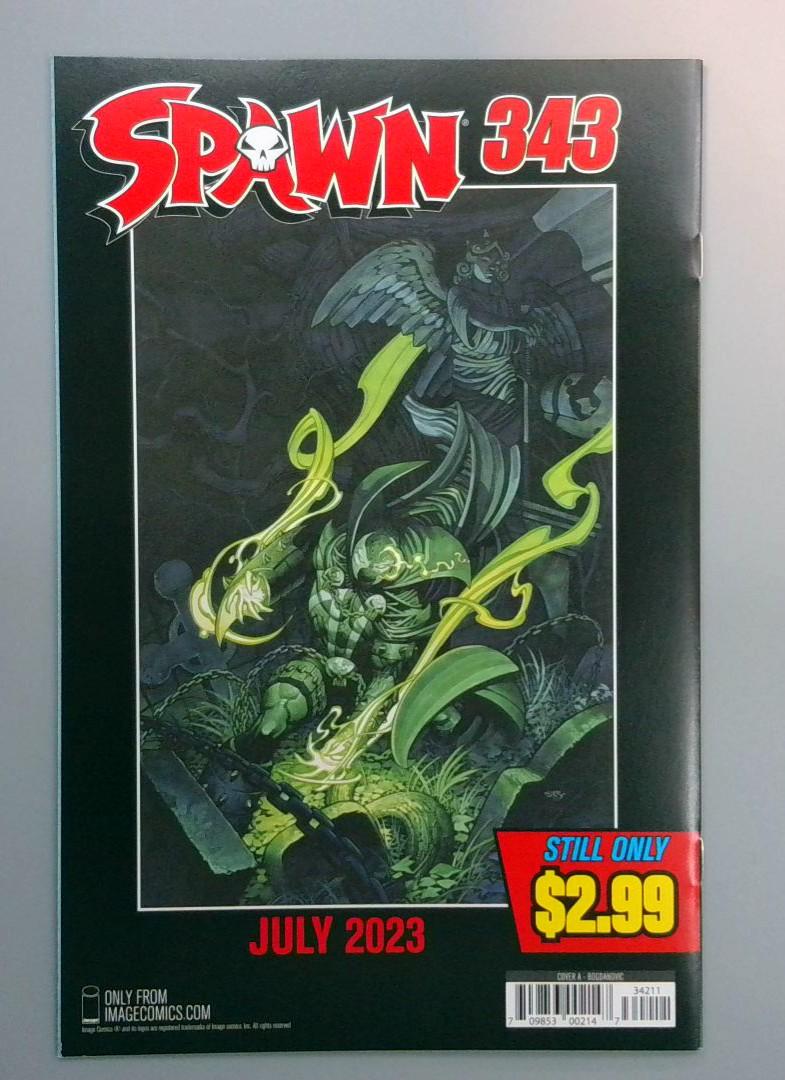 Spawn #343 continues the epic saga of Al Simmons, the hellspawn warrior, as he battles demonic forces and grapples with his cursed existence in a dark, supernatural world filled with chains, necroplasmic powers, and infernal intrigue. This issue features intense action sequences with Spawn wielding his symbiotic suit against otherworldly threats, highlighting themes of redemption and eternal conflict. Cover art by McFarlane and Barberi showcases Spawn in a dynamic pose with glowing energy and chains, while the back cover depicts a menacing, winged green demon entity.