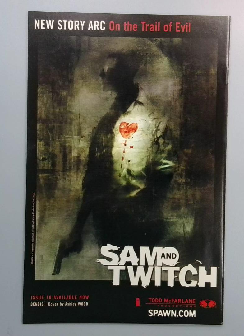 Spawn #95 kicks off the new story arc "On the Trail of Evil," featuring Spawn in a fiery confrontation with demonic forces, showcasing his iconic red cape, chains, and hellfire powers in a dynamic cover by Greg Capullo. This issue delves into Spawn's ongoing battle against supernatural threats, blending horror and action in Todd McFarlane's signature style. The back cover promotes the companion series Sam and Twitch, highlighting their gritty detective work in the Spawn universe, with art by Angel Medrano.