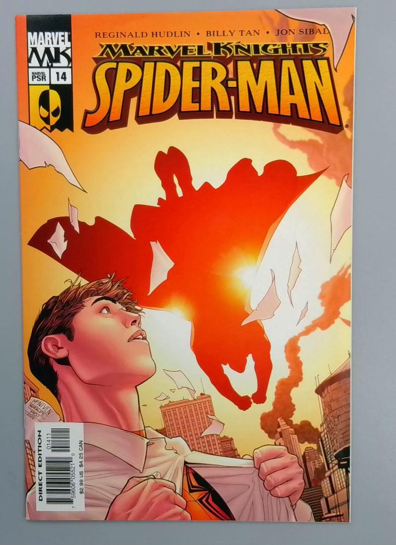 Marvel Knights Spider-Man #14 features a dramatic cover showcasing Spider-Man with a red-silhouetted figure in an intense, fiery urban backdrop. The issue is part of the Marvel Knights imprint, written by Reginald Hudlin and illustrated by Billy Tan and Jon Sibal. The cover suggests a high-stakes confrontation with powerful, dynamic artwork that captures the dramatic tension of the story.