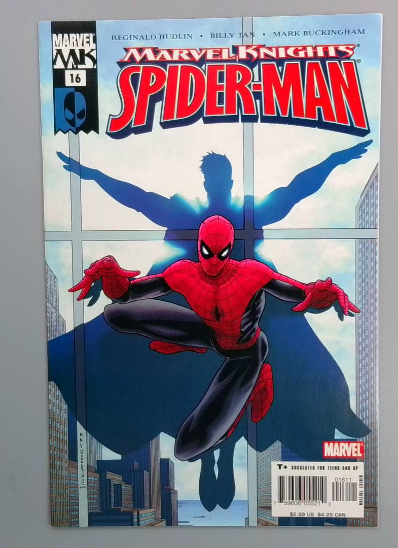 Marvel Knights Spider-Man #16, written by Reginald Hudlin with art by Billy Tan and Mark Buckingham. This issue is part of the Marvel Knights imprint, featuring a dynamic cover showcasing Spider-Man in his classic red and blue costume, with an imposing silhouette behind him against a cityscape backdrop. The issue continues the Marvel Knights storyline, known for its grittier and more mature approach to Marvel heroes.
