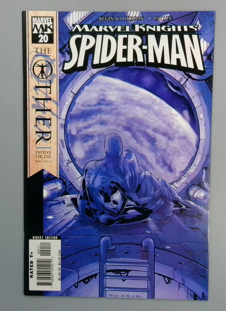 Marvel Knights Spider-Man #20, part of the "Evolve or Die" storyline, showcases a unique sci-fi inspired narrative featuring Spider-Man in a futuristic, blue-tinted setting. The issue is part of a 12-issue series written by Reginald Hudlin and features a striking cover depicting Spider-Man in a spacecraft or advanced technological environment, with a large planetary body in the background. This installment appears to explore themes of evolution and survival, typical of the Marvel Knights imprint known for its edgier, more mature storytelling approach.