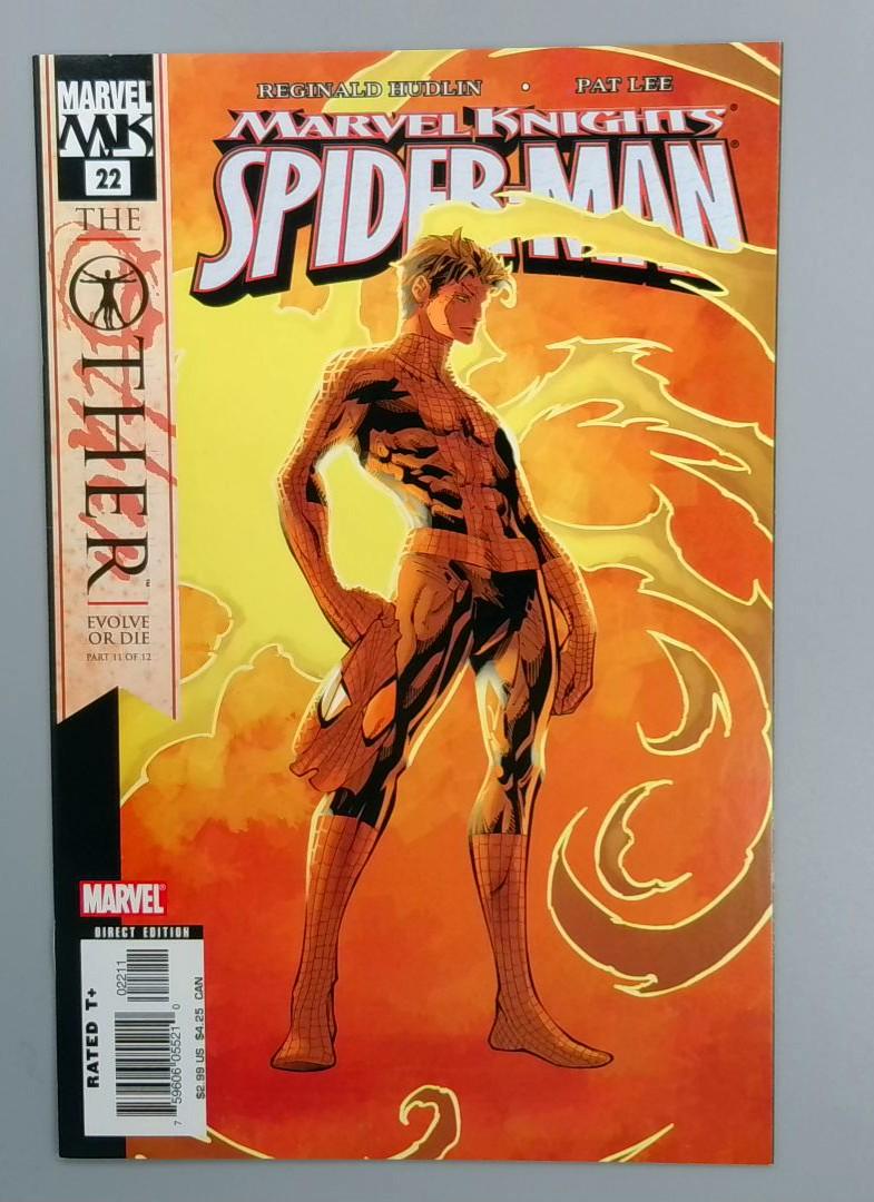 Marvel Knights Spider-Man #22, part of the "Evolve or Die" storyline, features a striking cover by Pat Lee showcasing Spider-Man in a dynamic pose against a fiery orange and yellow background. The issue is part of a 12-issue arc written by Reginald Hudlin, exploring a pivotal moment in Spider-Man's character development. This comic is from the Marvel Knights imprint, known for its edgier and more mature storytelling approach to Marvel characters.
