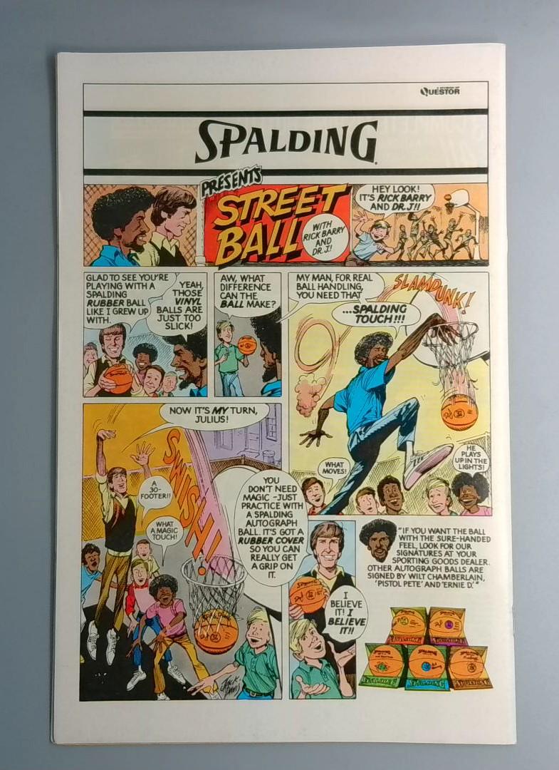 The back cover features a Spalding basketball advertisement presented as a comic story, with Rick Barry and Dr. J promoting the Spalding basketball brand through an entertaining narrative about street ball and autographed basketballs.