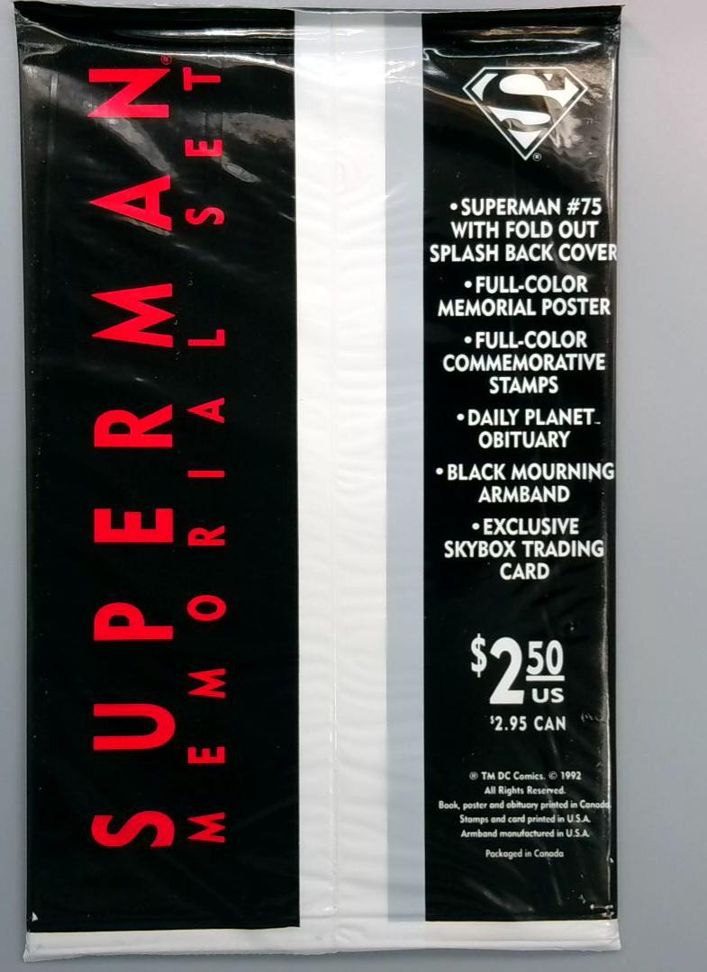 Superman #75 Memorial Package - The infamous "Death of Superman" special collector's set featuring a black-bagged special edition comic with a dramatically bloodied/dripping Superman logo. This commemorative package includes a full-color memorial poster, commemorative stamps, Daily Planet obituary, black mourning armband, and an exclusive Skybox trading card. The landmark issue chronicles the epic battle between Superman and Doomsday, resulting in the shocking death of the iconic superhero.