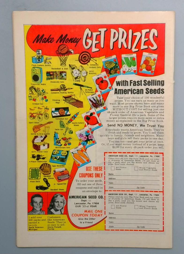 The back cover features a classic vintage advertisement for American Seeds, offering children the opportunity to earn money and prizes by selling seed packets—a nostalgic artifact of mid-century American consumer culture.