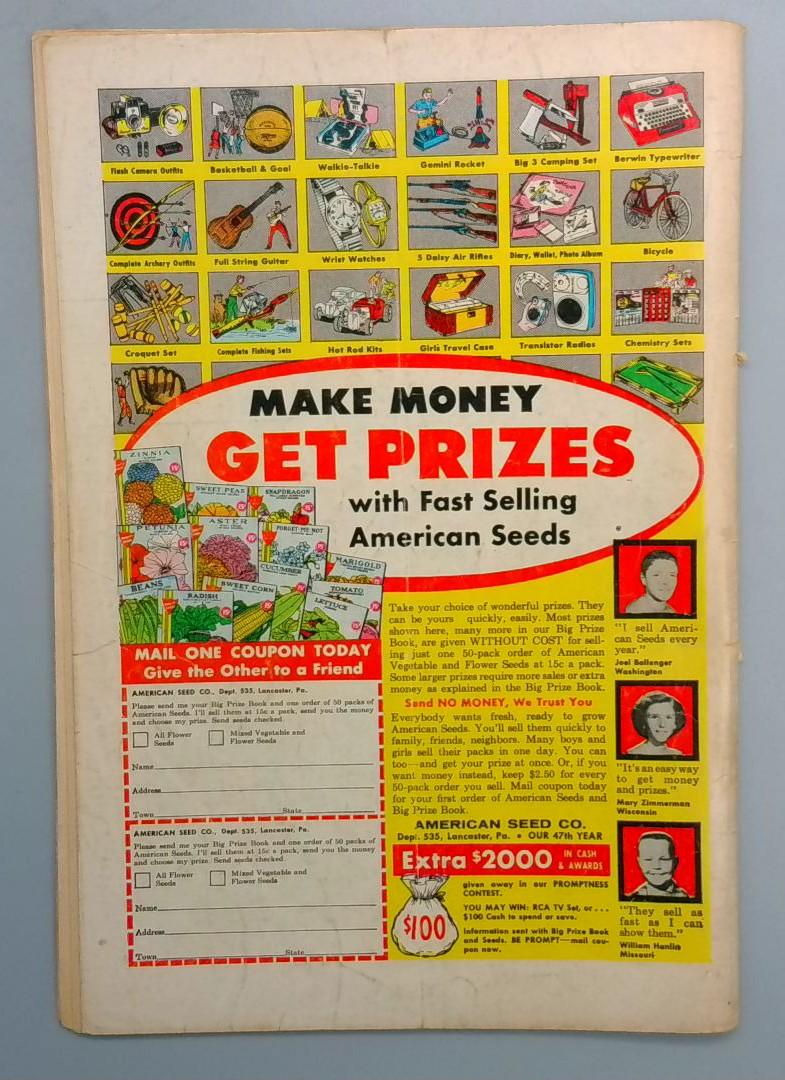 The comic also includes vintage advertising on the back cover for American Seeds, promoting a prize-winning contest where readers could earn money and prizes by selling seeds—a classic mid-century mail-order scheme targeting young comic book readers.