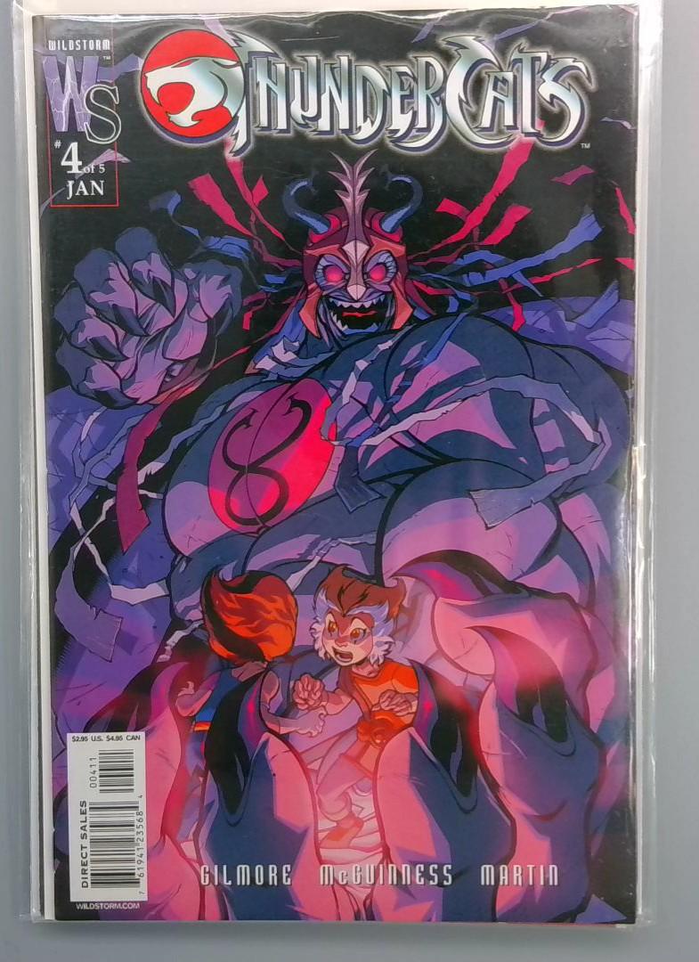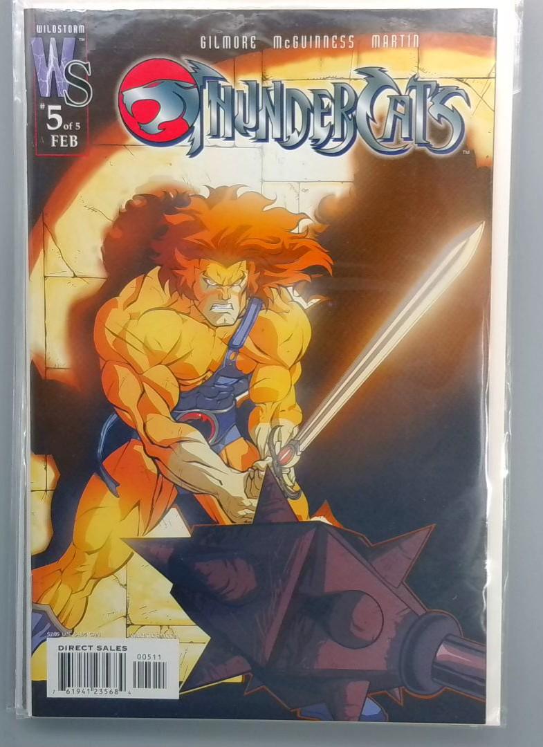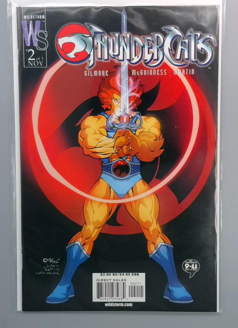 A first issue of the Wildstorm comic book series based on the beloved animated show Thundercats. This debut issue features the entire core team of cat-like humanoid heroes, with dynamic artwork by the creative team of Gilmore, McGuinness, and Martin. The cover showcases Lion-O and the other Thundercats in an energetic group pose, wielding their signature weapons and displaying their distinctive personalities.