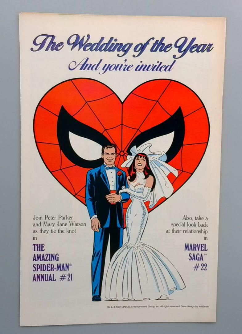 The Uncanny X-Men #221 features a dynamic cover showcasing a dramatic confrontation, with characters caught in an intense, angular composition against a striking blue background. This issue is significant as it precedes the first full appearance of a major antagonist, hinting at an impending conflict that will shape future storylines. The artwork emphasizes movement and tension, typical of the era's comic book style. The accompanying image reveals a wedding invitation for Peter Parker and Mary Jane Watson, promoting The Amazing Spider-Man Annual #21. This landmark issue commemorates the marriage of two iconic Marvel characters, offering fans a special glimpse into their relationship and marking a significant moment in Spider-Man's personal history.