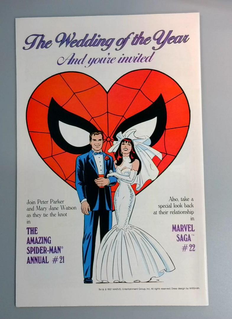 The Uncanny X-Men #224 features a dynamic cover showcasing intense action with a radial blue background and characters in dramatic poses. This issue appears to be from the mid-1980s Marvel run, with bold graphic design typical of the era. The cover suggests a high-energy confrontation involving mutant characters, with striking visual composition and vibrant color palette. The accompanying wedding invitation for The Amazing Spider-Man Annual #21 promotes the wedding of Peter Parker and Mary Jane Watson, highlighting a significant moment in Marvel Comics history. The invitation itself is designed as a commemorative piece, inviting readers to join the celebration and explore the couple's relationship in Marvel Saga #22.