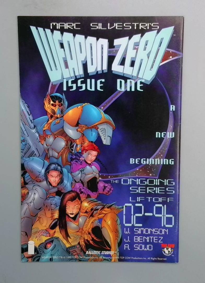 Witchblade #2 from Image Comics features a striking cover by Michael Turner showcasing the titular character - a powerful supernatural heroine whose body is partially covered by an intricate, biomechanical armor. The comic is part of the early Top Cow Productions run, written by David Wohl with art by Turner. This issue continues the dark fantasy storyline of the mystical Witchblade weapon and its bearer, blending elements of supernatural action and technological design. Weapon Zero #1 (Issue One) is the debut of Marc Silvestri's sci-fi series published by Image Comics, featuring a team of futuristic characters in armored suits. The comic promises a "new beginning" with a diverse cast of characters and a science fiction narrative set against a cosmic backdrop. The first issue introduces the ongoing series, with art by W. Simonson, J. Benitez, and A. Solid, highlighting the dynamic and visually intricate character designs typical of Image's 1990s style.