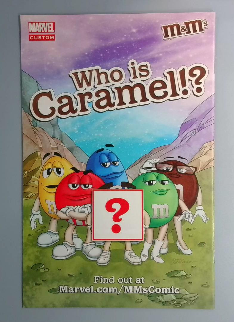 Also included is a promotional M&M's Marvel custom comic crossover featuring the playful "Who is Caramel?" campaign, blending the classic candy characters with Marvel branding for a unique collectible experience.