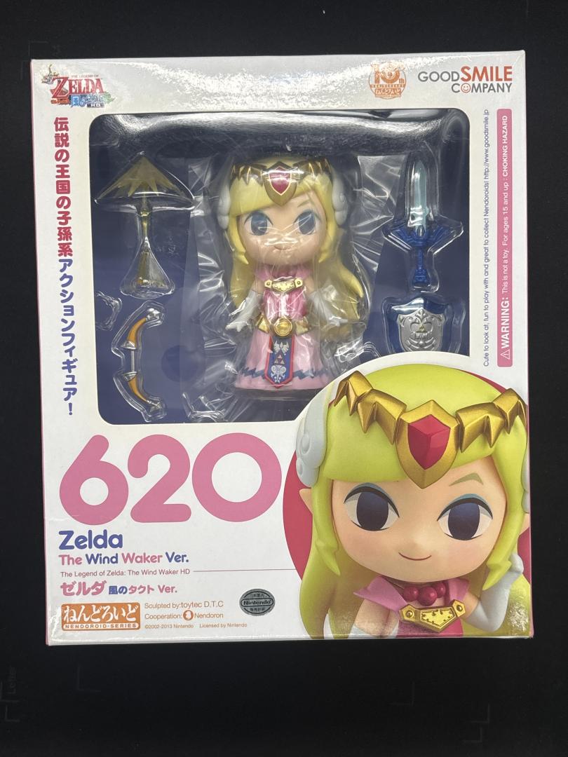 Nendoroid Zelda: The Wind Waker Ver. (#620) features the iconic princess in her signature pink and gold outfit with blonde hair adorned with a red jeweled tiara. The figure includes multiple interchangeable parts including alternate faceplates and hand pieces for posing versatility. The figure is in excellent condition with all original packaging intact, showing minimal wear. Includes a display stand and various accessories as shown in the back packaging reference images.